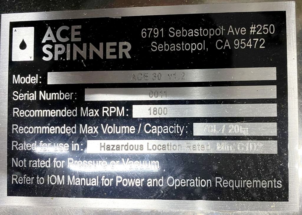 The Ace Spinner ACE-30 sanitary hemp/alcohol extractor, 316SS. is engineered for high-efficiency extraction processes, making it an essential tool for industries focused on botanical extraction. With a maximum bowl speed of 1800 RPM and a force of 1086 x G, this extractor ensures rapid and thorough processing of hemp and other botanical materials. The 24 x 12-inch perforated removable basket is designed for easy loading and unloading, allowing operators to maximize productivity while maintaining a clean and sanitary environment. The vaportight, pneumatic flip-top design enhances safety and efficiency by minimizing the risk of contamination and ensuring that volatile compounds are effectively contained during the extraction process. With a volume capacity of 60 gallons and the ability to wash up to 35 lbs of biomass per run, the Ace Spinner ACE-30 is capable of handling substantial extraction demands with ease.