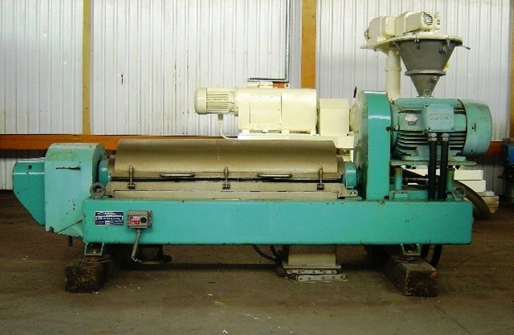 Max bowl speed 2700 RPM, 1450 G's, 14" x 34" bowl ID. 5" single lead hardsurfaced conveyor, 40 HP XP motor 460/3/60/1750 RPM, 7.5 HP backdrive, 350 kNm 57:1 planetary gearbox, clutch and limit switch, feed tube, guards, vibration isolators/switch and chutes, unitized on a stand with feed pump. 1981 vintage. Very good condition