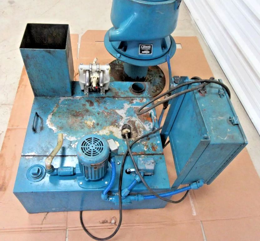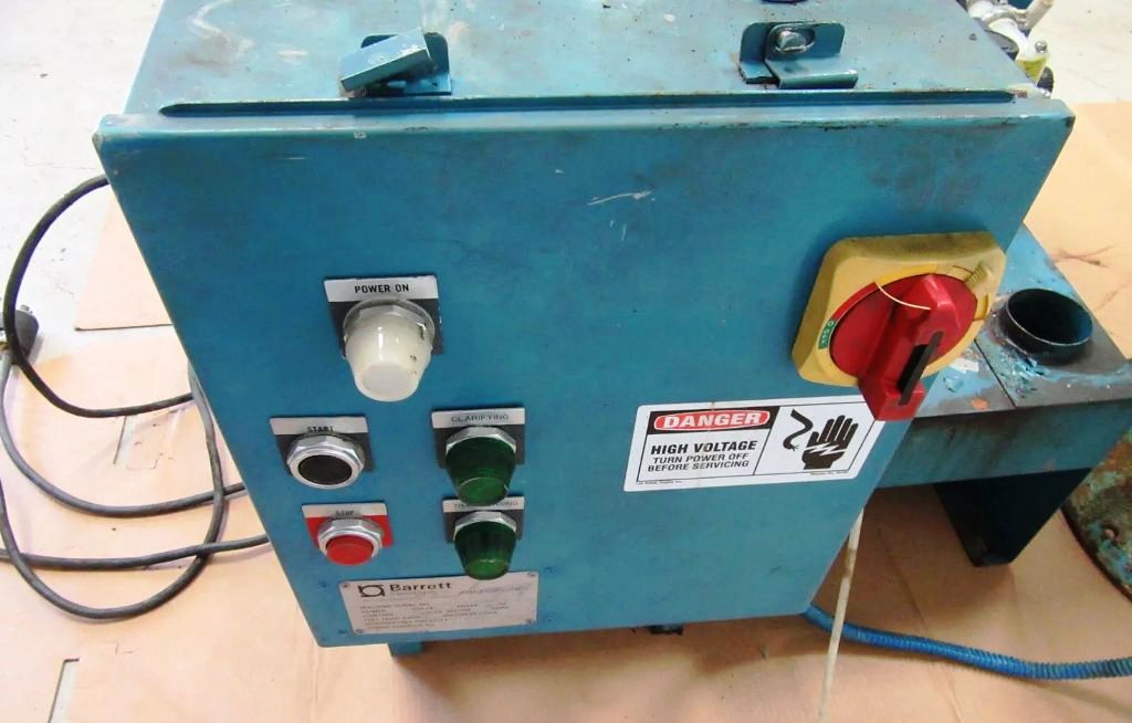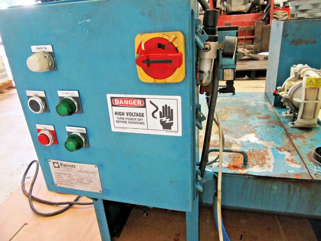 The Barrett 236 Clarifuge centrifuge is powered by a robust 3 HP motor, compatible with 230/460/3/60 power supply configurations, making it versatile for various industrial settings. The motor's high RPM capability ensures that the centrifuge can handle demanding applications with ease. Additionally, the control panel and feed pump are conveniently mounted on the fluids storage tank, providing an integrated solution that simplifies operation and monitoring. This thoughtful design not only enhances user accessibility but also contributes to a streamlined workflow, allowing operators to focus on other critical tasks. The centrifuge is in very good condition, reflecting its durability and reliability, which are essential attributes for any industrial equipment.
