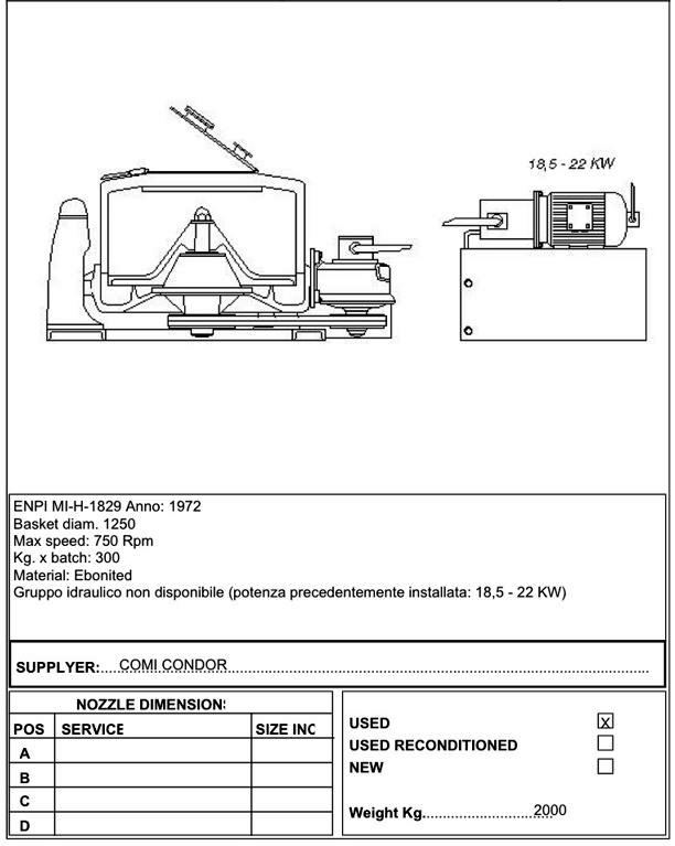 The Comi-Condor 1250mm solid basket centrifuge, SS/rubber-lined, is engineered for high-efficiency separation processes, making it an ideal choice for various industrial applications. With a maximum bowl speed of 750 RPM and a load capacity of up to 300 kg, this centrifuge is designed to handle substantial volumes while ensuring optimal performance. The robust 18.5 KW motor, operating at 380V/3/50/1450 RPM, provides the necessary power to achieve consistent results, even under demanding conditions. The adjustable skimmer tube allows for precise control over the discharge of separated materials, enhancing the overall efficiency of the separation process. This top unload design further simplifies material handling, making it easier to manage the output without compromising safety or efficiency.