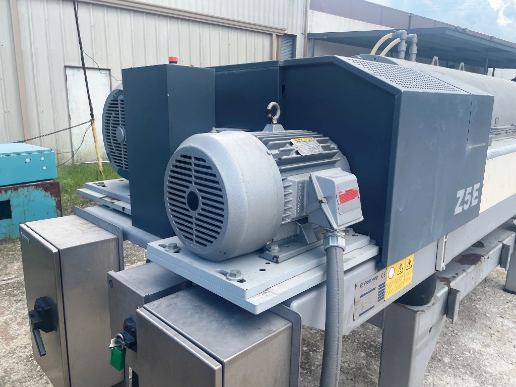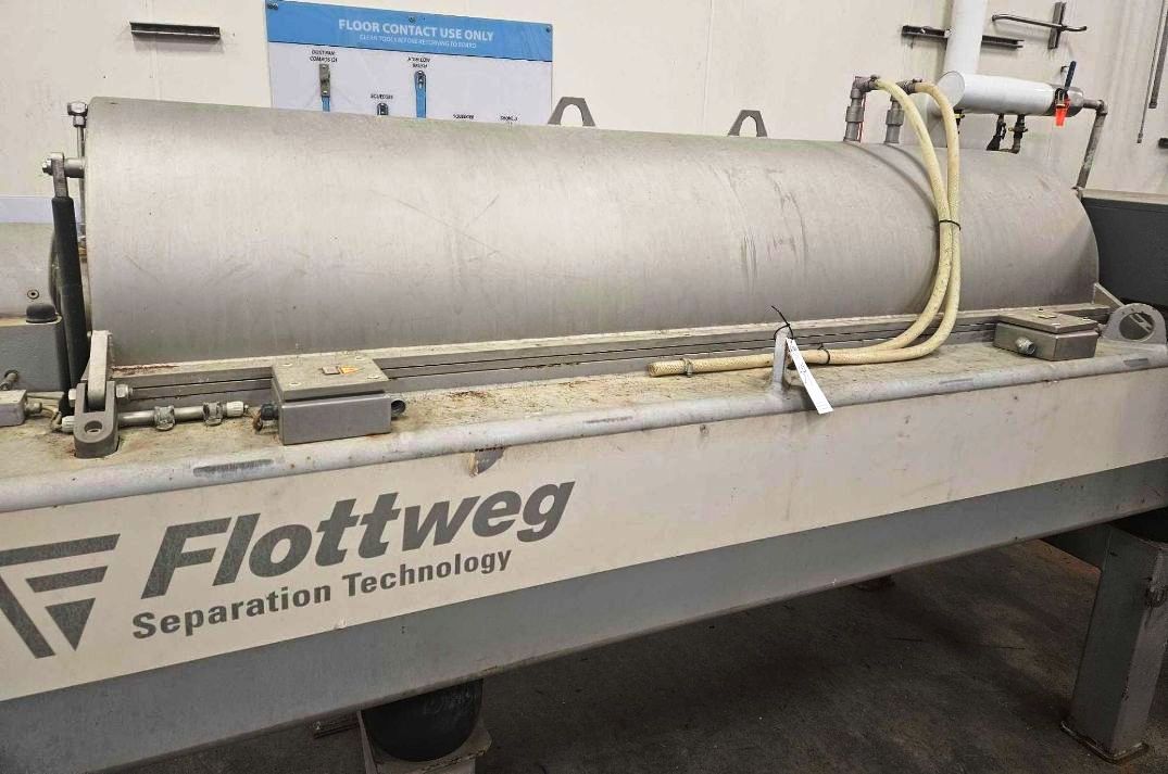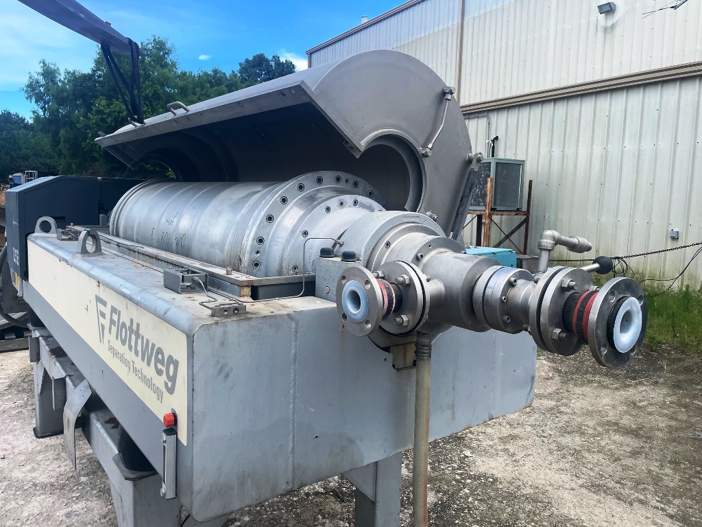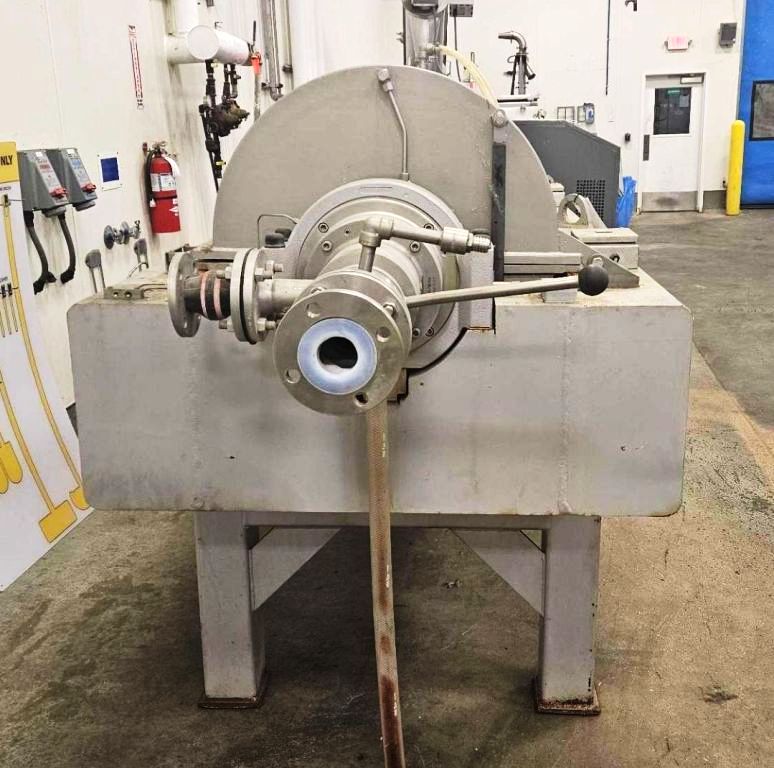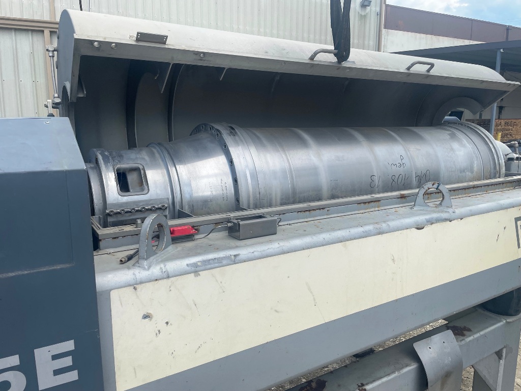 Max bowl speed 3500 RPM, 3650 x G, 21" x 84" bowl ID. 15 degree beach angle, on-the-fly adjustable pool depth arm, liquid discharged under pressure, 7" single lead hardsurfaced conveyor, 75 HP motor 460/3/60/1780 RPM, 20 HP backdrive, SIMP-Drive dual VFD and planetary gearbox, polymer feed tube, guards, vibration switch/isolators, chutes and stand. No control panels. 2009 vintage. Excellent condition.