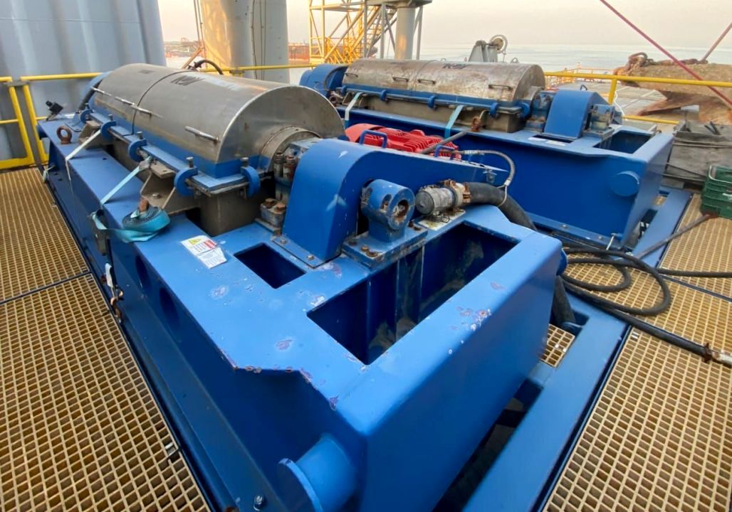 Max bowl speed 3200 RPM, 2617 x G, rated @ 800 LPM. 3.25" double lead STC-tiled conveyor, 60 HP XP motor 480/3/60/1775 RPM with variable frequency drive controller, SA-44 80:1 gearbox with torque arm assembly, feed tube, guards, vibration isolators/switch and NEMA 3 control panel. Mounted on oilfield skid. One year OEM warranty. Optional items: 3" heavy duty feed pump on skid with 20 HP motor and cord, VFD for pump motor, telescoping stand with lay down handrails and fall arrestor.