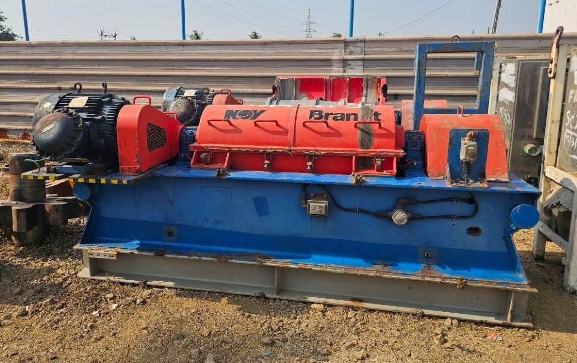 Max bowl speed 3800, 2870 x G, hogged-out cake ports, ring dam liquid ports, 4.25" single lead STC-tiled conveyor, 40 HP XP motor 230/460/3/60/1760 RPM, guards, 52:1 gearbox with TA assembly, feed tube and XP controls, unitized on an oilfield skid with stand and feed pump. Very good condition. Located in India.
