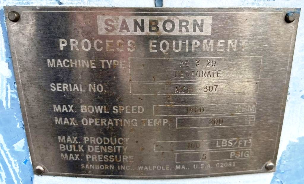 In addition to its impressive technical specifications, this centrifuge is in very good condition, reflecting its durability and the quality of materials used in its construction. The Hastelloy C276 material offers excellent resistance to corrosion and wear, making it suitable for handling aggressive chemicals and harsh environments. This ensures longevity and reliability, reducing the need for frequent maintenance and replacements. Overall, the Sanborn 32 x 20 perforate basket centrifuge is a top-tier choice for industries looking to enhance their separation processes with a dependable and efficient solution.