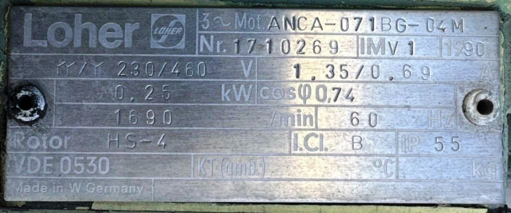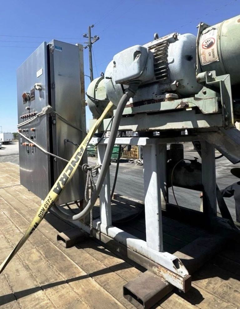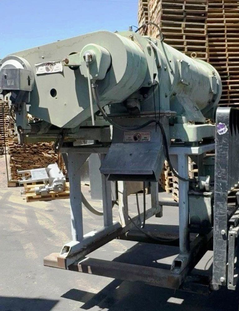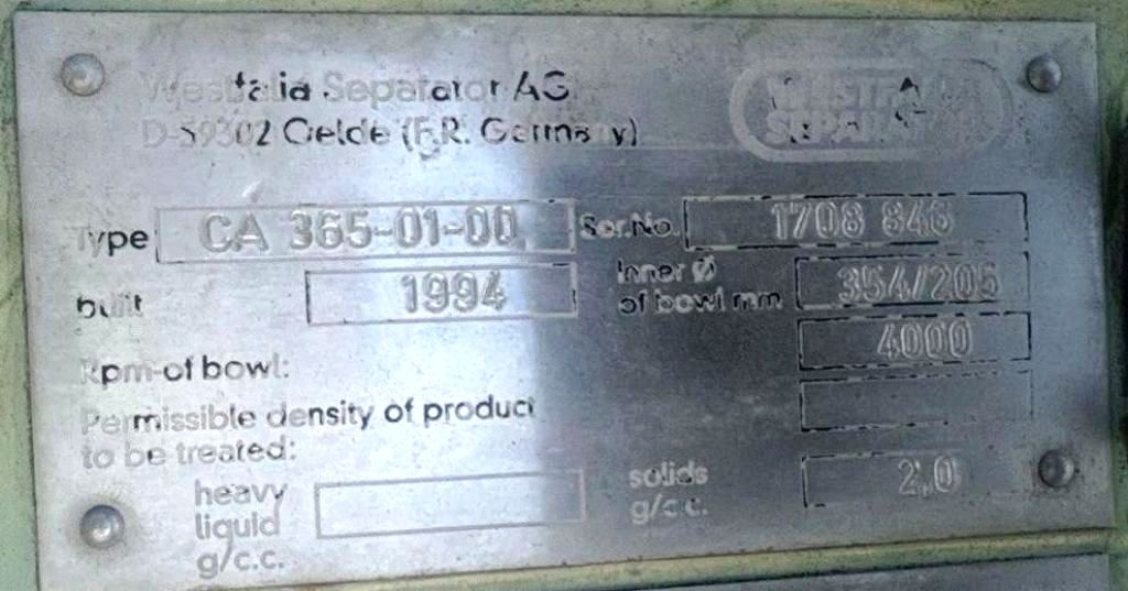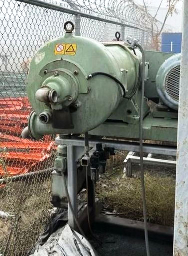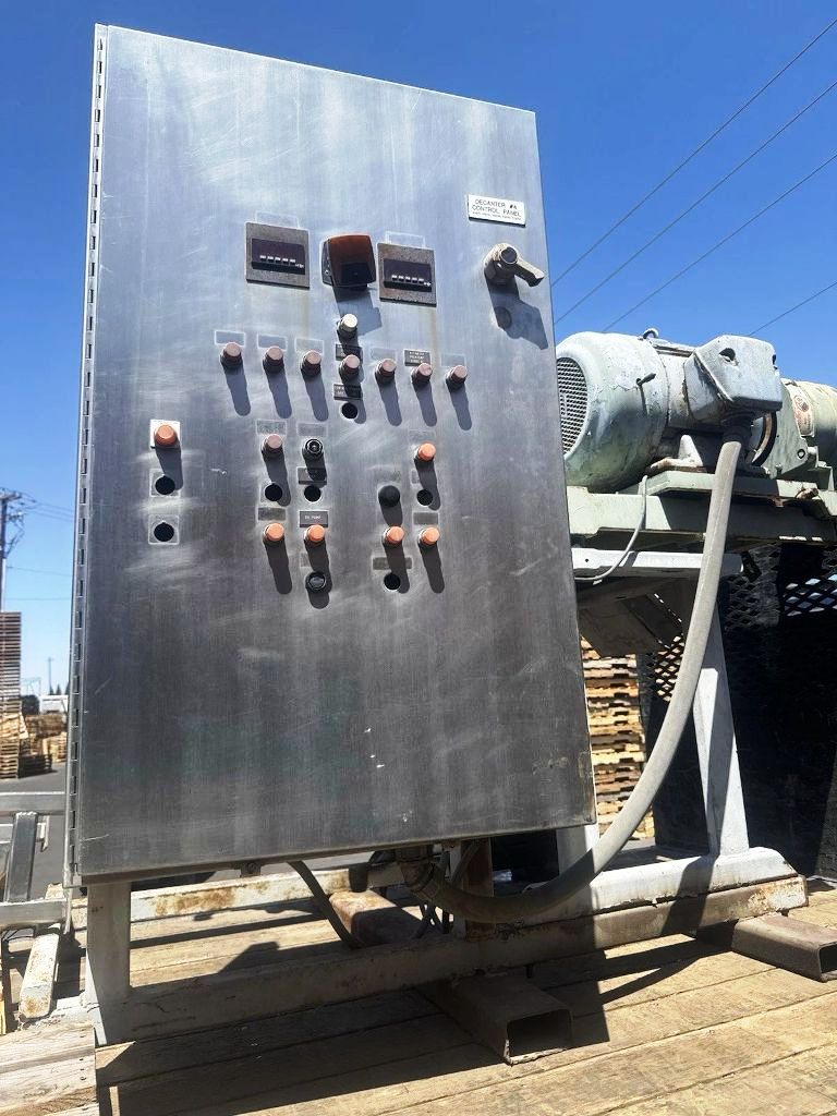 Max bowl speed 4000 RPM, 3180 x G, 8 degree beach angle, effluent discharged under pressure, 70mm double lead hardsurfaced conveyor, 40 HP motor 460/3/60/3480 RPM, Viscotherm hydraulic backdrive system, lube system, guards, feed tube, vibration isolators/switch and chutes, mounted on a stand with control panel. 1994 vintage. Very good condition.