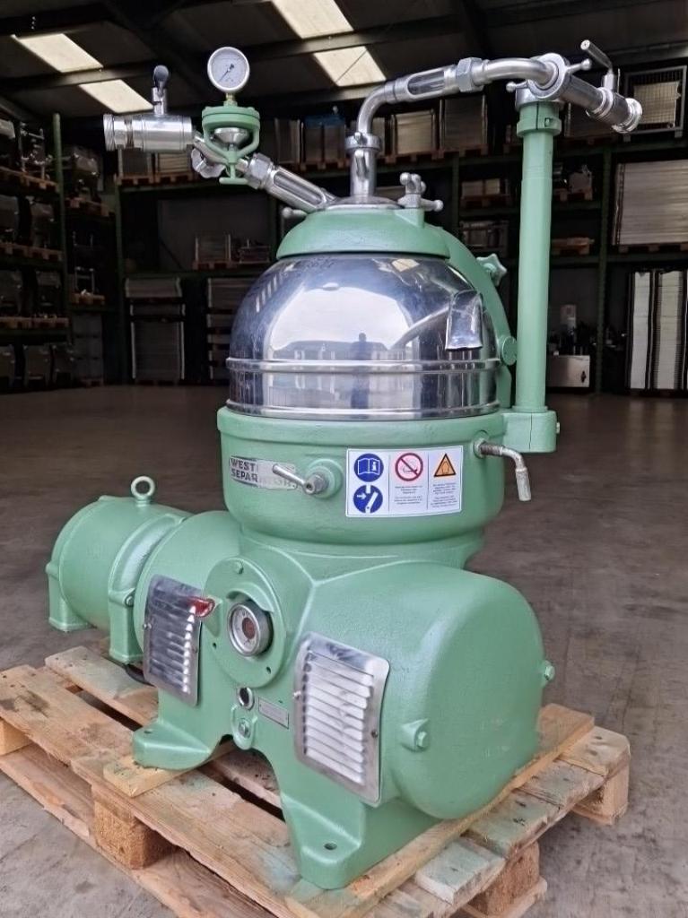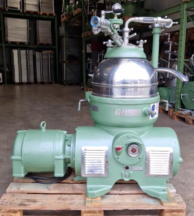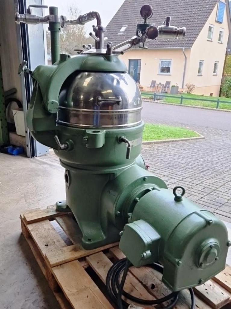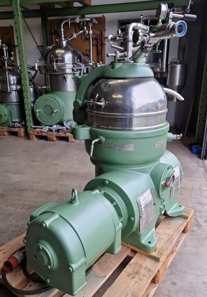 Max bowl speed 6500 RPM, rated @ 3000 LPH on wine mist, 2 chambers. 7.5 KW motor 380/3/50/1450 RPM, flow meter, base frame, tools, starter panel and manual. Reconditioned to "as new." Located in Europe.