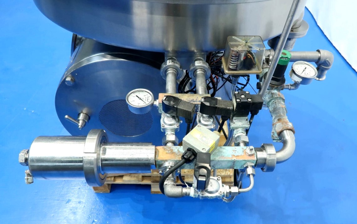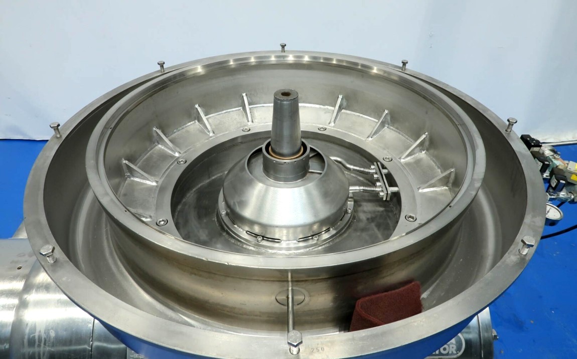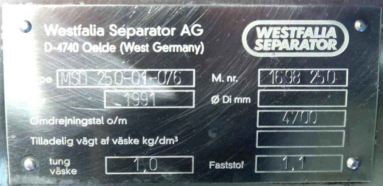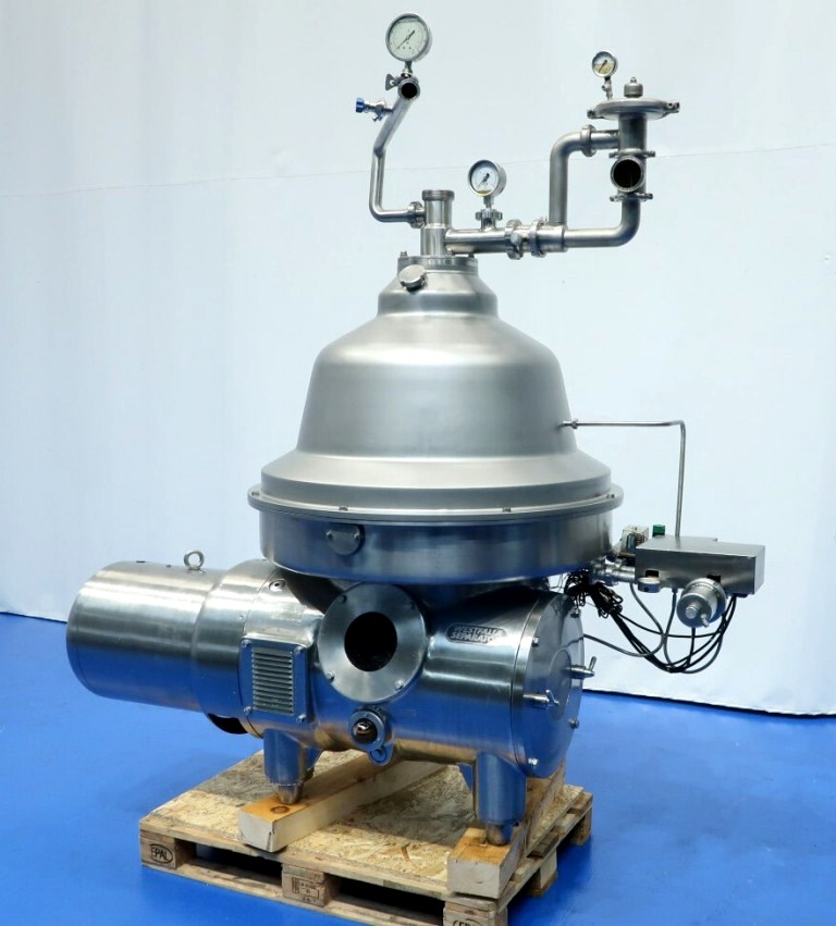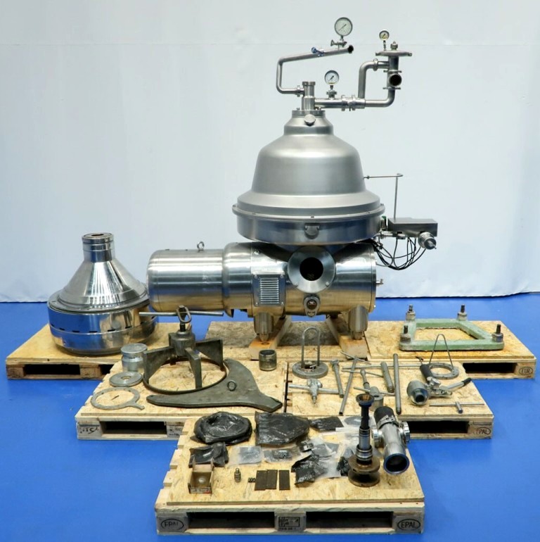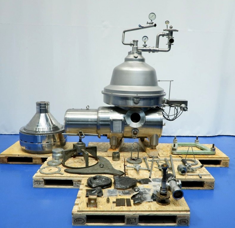 Max bowl speed 4700 RPM, rated @ 30,000 LPH. 37 KW motor 380/3/50/1475 RPM, water harness, base frame, tools, all valves, flow meter and manual. No control panel. 1991 vintage. Very good condition. Located in Europe.